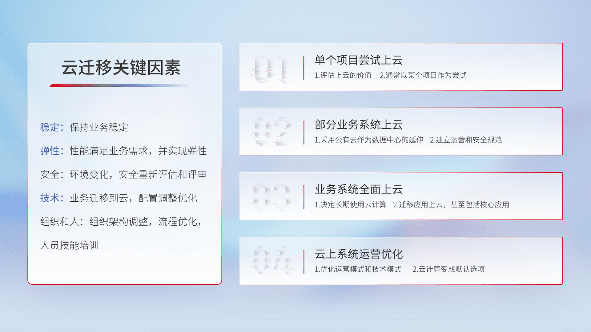 结合实际业务,,从规划设计、、、、云平台选型、、、、云原生改造、、、、数据迁移、、集成交付,,迁移全过程为客户识别最佳上云路径,,做好风险识别管理,,设计网络架构、、、、身份权限、、、、安全审计合规、、、操作审计、、、、日志审计、、、、监控告警策略、、、、多站点容灾设计等,,,对云上基础设施进行整体规划,,提升IT治理水平,,,以满足弹性、、、高可用、、、、高性能的需求。。。。