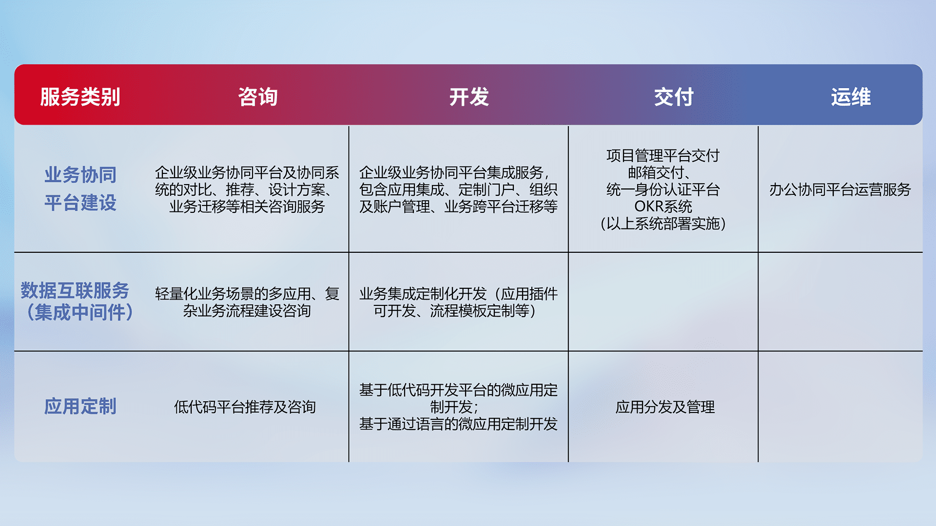针对钉钉、、、企微、、IDaas等平台级产品提供产品的规划、、、方案、、、交付、、、、定制化开发等服务,,实现如统一协同办公、、智能客户服务、、、、混合会议管理、、、智能数据查询、、等业务场景,,,实现数字化转型。。。